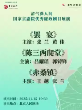 “清气满人间——国家京剧院优秀廉政剧目展演”京剧折子戏《罢宴》《陈三两爬堂》《赤桑镇》 时间:2025.11.15 周六 19:30 场馆:北京市 | 北京人民剧场 票价:100/180/280/380 微信订票:18515362586 电话订票:010-66552100,010-66552258
